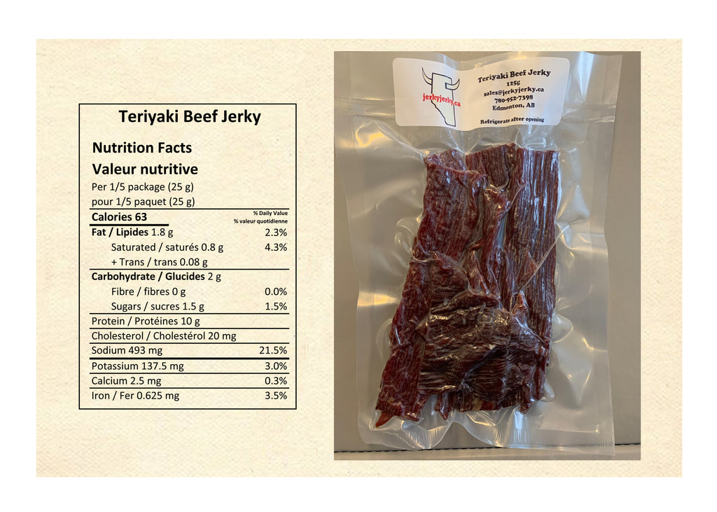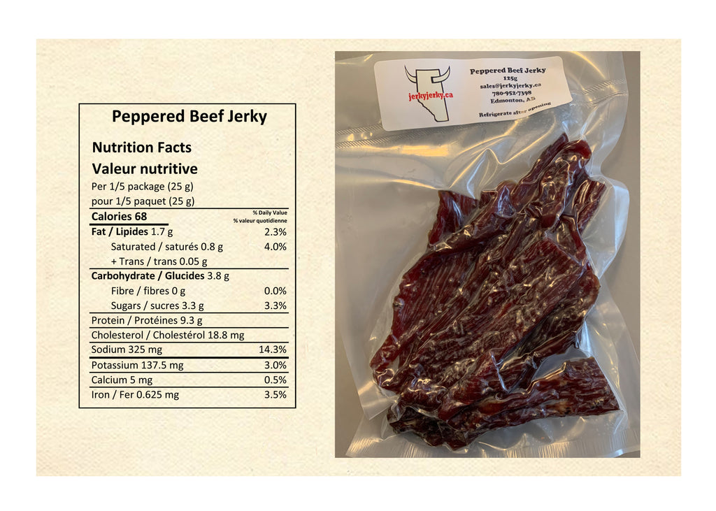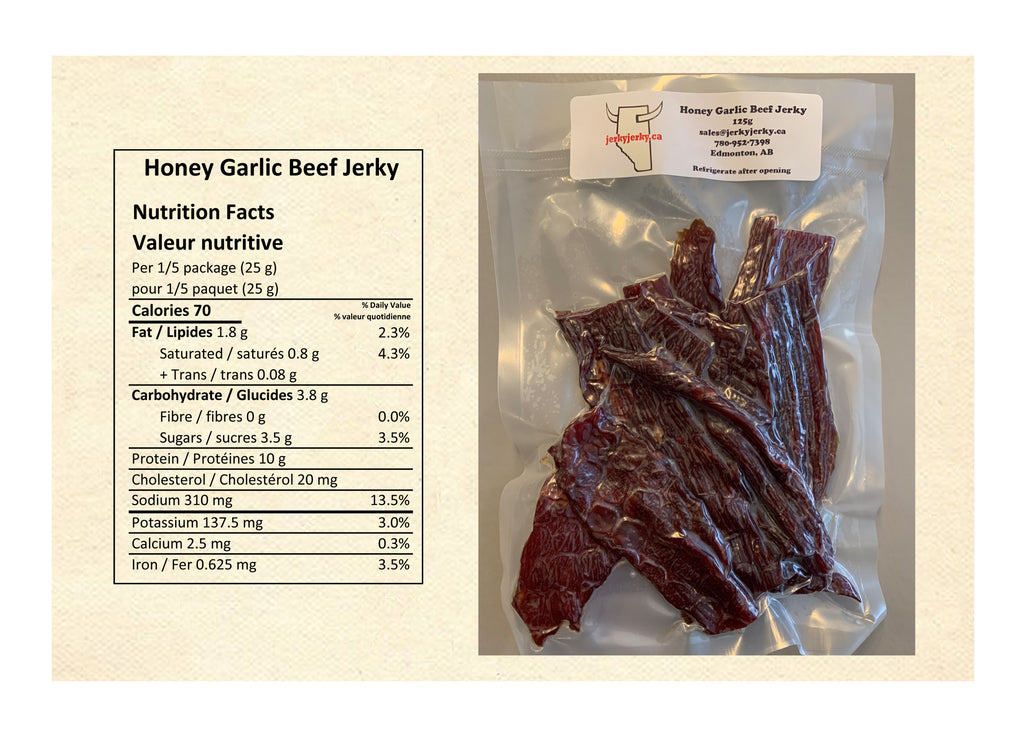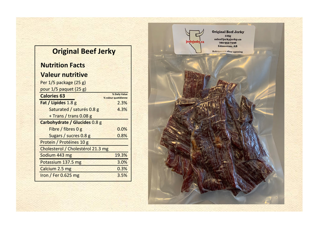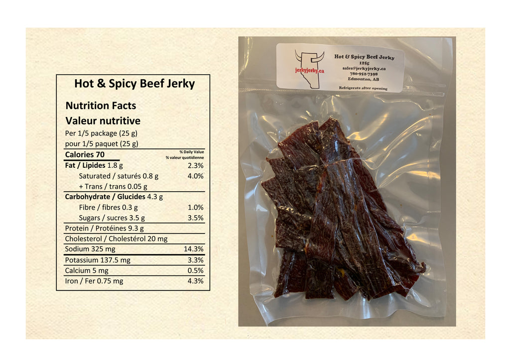 Try-em-all 6-Pack has one of each Original, Teriyaki, Honey Garlic, Peppered, Hot & Spicy, and Maple beef jerky. All our beef jerky is made with 100% Alberta beef and packaged in vacuum sealed 125 gram packs.